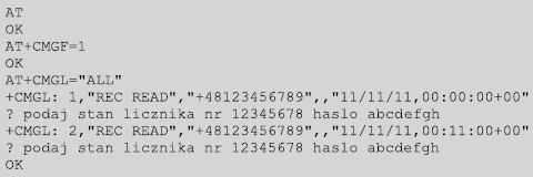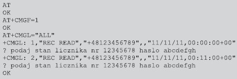 | Przykładowy zestaw komend AT w trakcie odczytu SMS od użytkownika systemu. Listing przedstawia komunikację z modemem w czasie odbioru dwóch kolejnych SMS z pytaniem o stan licznika na numer karty SIM w koncentratorze: +48123456789 z dn.11/11/11 z godz. 00:00:00 i 00:11:00. | |