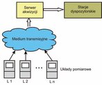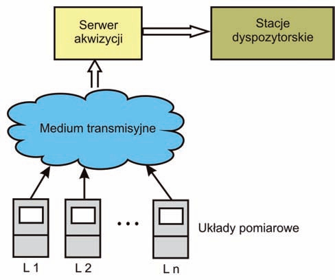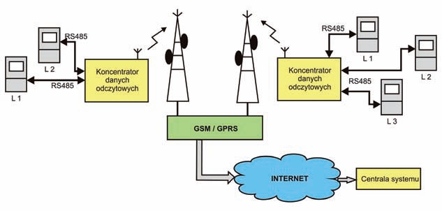 Liczniki energii elektrycznej są podłączone interfejsem RS-485 do koncentratora danych pomiarowych, który poprzez modem GSM/GPRS łączy się z punktem dostępowym do internetu, udostępnionym przez operatora sieci GSM, a następnie przez internet z serwerem akwizycyjnym (bazą danych odczytowych). KDO po nawiązaniu połączenia wysyła dane z licznika energii elektrycznej. Dane mogą być wysyłane w czasie rzeczywistym lub buforowane w KDO i wysyłane pakietowo. Serwer akwizycyjny stanowi komputer zoptymalizowany do gromadzenia dużej ilości danych oraz szybkiego przetwarzania i wyszukiwania informacji. Komputer ten jest połączony z siecią internet za pomocą łącza stałego. Ważną cechą połączenia serwera z internetem jest jego stały adres IP, który umożliwia odnalezienie serwera w sieci przez KDO. Zadaniem serwera akwizycyjnego i aplikacji klienckiej jest rejestracja oraz wizualizacja przychodzących wyników.