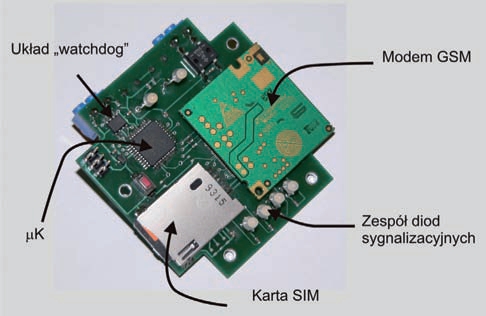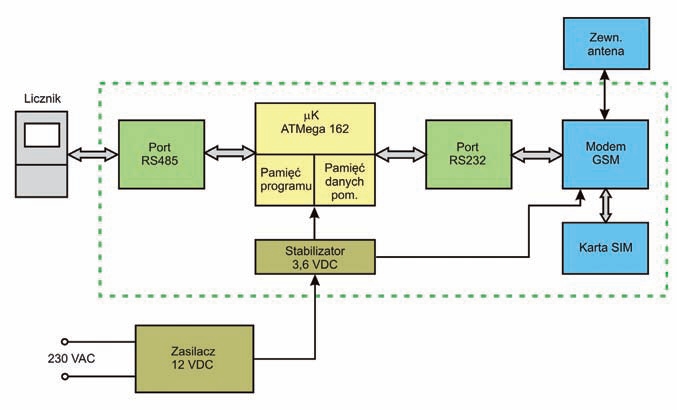 Głównym elementem koncentratora jest mikrokontroler ATMega162, pełniący rolę układu sterującego transmisją danych oraz buforującego dane odczytowe. Koncentrator zawiera także modem GSM Huawei MG323 z anteną zewnętrzną i gniazdem karty SIM oraz zespół diod sygnalizacyjnych. Układ został wyposażony także w zegar czasu rzeczywistego i watchdog zapewniający automatyczny reset stanów nieprawidłowych. Całość jest zasilana z zasilacza zewnętrznego 12 V DC. Napięcie to jest obniżane w układzie do wymaganej przez modem GSM wartości 3,6 V DC (rys. 3).
