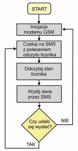 W trybie SMS komunikacja z urządzeniem odbywa się za pomocą wiadomości SMS. Urządzenie pozostaje w stanie uśpienia ze względu na konieczność oszczędzania energii. Użytkownik wysyła SMS na podany numer karty SIM. Wiadomość ta „budzi” mikrokontroler, który był dotąd w stanie czuwania, a następnie po sprawdzeniu poprawności danych w SMS odczytuje aktualny stan licznika energii elektrycznej i odsyła odpowiednio sformatowanym komunikatem SMS na podany numer telefonu informację z odczytem, bieżącą datą i czasem odczytu oraz numerem i typem licznika. Algorytm połączenia przestawiono na rys. 6.