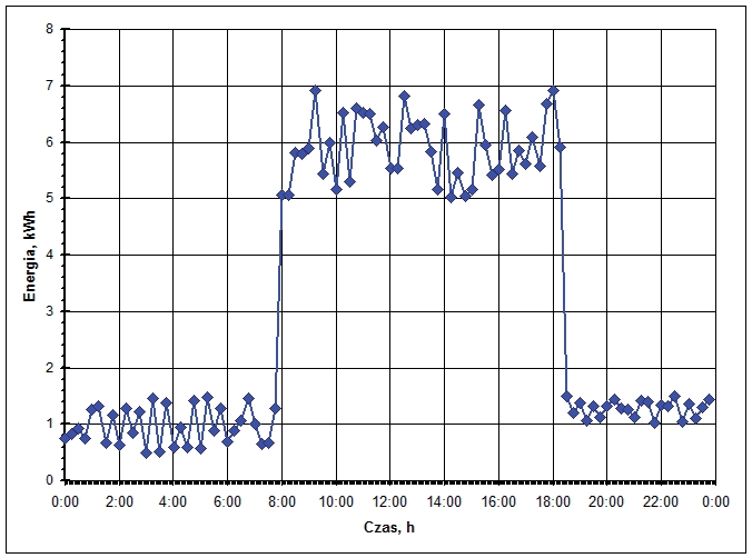 Przykładowy wykres zużycia energii czynnej otrzymany po odczytaniu danych z serwera akwizycyjnego w czasie ośmiu godzin pokazany jest na rys. 7.