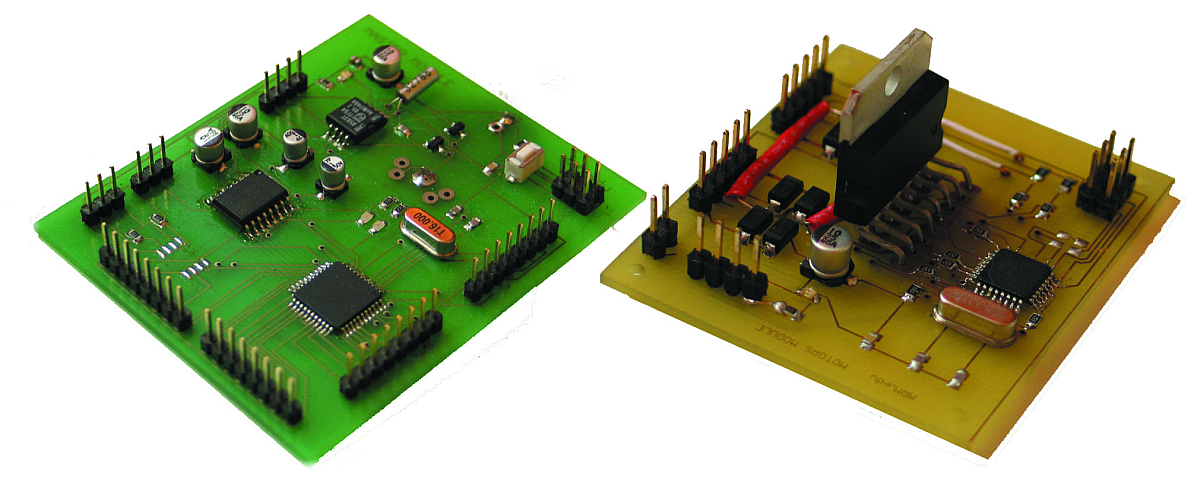 Moduły zostały wykonane metodą montażu powierzchniowego SMD na specjalnie przygotowanych płytkach drukowanych – zminiaturyzowanych oraz zoptymalizowanych pod względem łatwości montażu, zarówno elementów na płytce, jak i całych modułów w robocie (rys. 3).