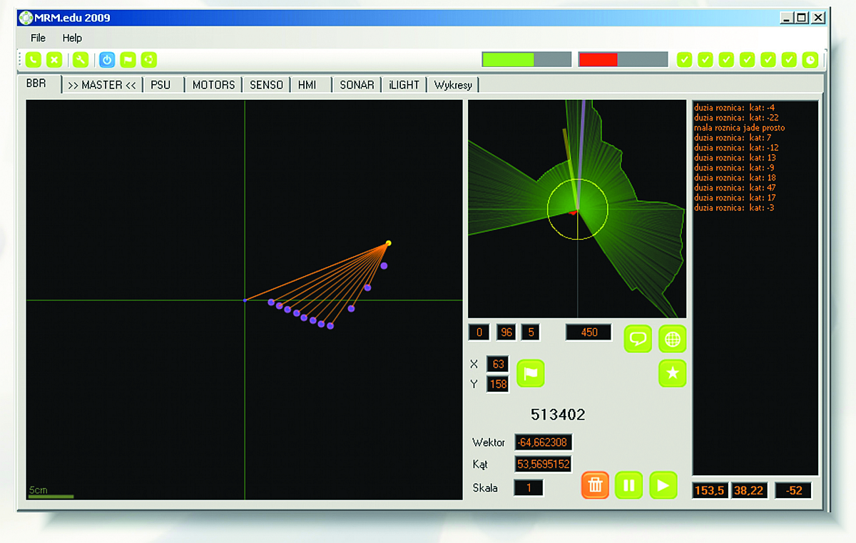 Pierwszym wykonanym rozszerzeniem funkcjonalnym platformy dydaktycznej MRM.edu był system nawigacji odruchowej. Takie nawigowanie zakłada, że nie jest określona żadna mapa otoczenia, a robot nie ma zaplanowanej trasy przejazdu do punktu docelowego. Aplikacja nawigacji określa w każdej chwili, na podstawie danych pomiarowych otoczenia, jaki będzie wykonany kolejny krok, prowadzący robota do określonego celu (rys. 4).