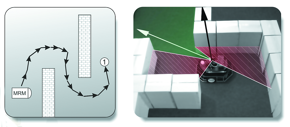 Odruchowy system nawigacji pozwala na unikanie kolizji zarówno z przeszkodami statycznymi jak i poruszającymi się. Dzięki temu możliwa jest nawigacja w nieznanym terenie, labiryncie, a nawet w sytuacji, gdy otoczenie ulega zmianom lub przemieszczają się ludzie bądź inne obiekty (rys. 5).