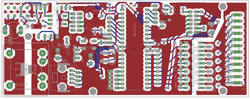 Projekt obwodu drukowanego wykonano w środowisku EAGLE. Głównym elementem układu jest mikroprocesor ATmega16. Za jego pośrednictwem odbywa się interpretacja stanów logicznych wejść cyfrowych, analiza sygnału analogowego lub załączanie i wyłączanie wyjścia tyrystorowego. Do monitoringu większości maszyn wykorzystane są wejścia cyfrowe, informujące o tym, czy dany proces jest aktywny. Przykładem może być: załączenie łuku elektrycznego spawarki lub jego brak, praca lub postój napędów, odczyt wartości indukcyjnych, optycznych lub stykowych czujników krańcowych, przepływ prądu w danym obwodzie, obecność zasilania itp. Monitorowanie stanu logicznego pracy poszczególnych elementów danej maszyny daje obraz jej funkcjonowania. Stany wejść odczytuje procesor i przez sieć zrealizowaną na bazie protokołu MODBUS przesyła je do bazy danych. Każdemu z czytników RFID przypisany jest unikalny adres, odpowiadający konkretnemu stanowisku, a sczytane wartości trafiają do odpowiedniej lokalizacji w bazie danych. Interpretacja danych wejściowych odbywa się w dedykowanej do tego celu aplikacji.