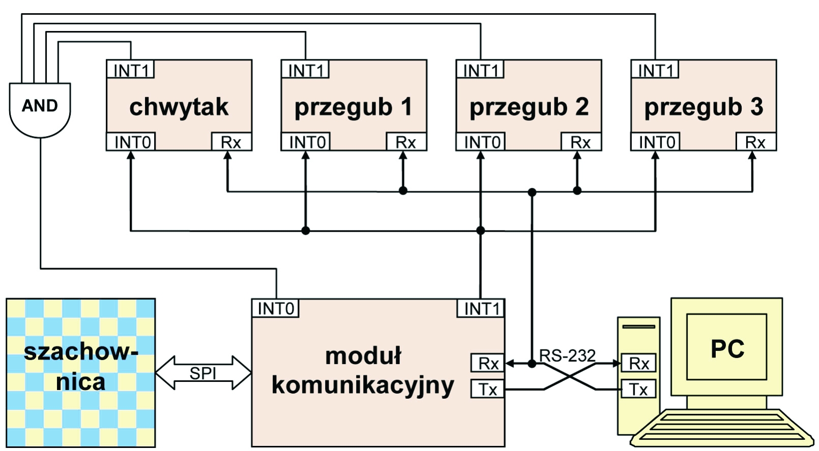Wykonanie ruchu przez robota: komputer poprzez interfejs RS-232 wysyła 14-bajtowy telegram do modułu komunikacyjnego umieszczonego przy szachownicy oraz modułów sterujących pracą przegubów i chwytakiem. Po odebraniu danych moduły te za pośrednictwem czterowejściowej bramki AND uruchamiają przerwanie zewnętrzne INT0 procesora w module komunikacyjnym. Następnie moduł komunikacyjny odsyła do komputera odebraną ramkę sprawdzając poprawność transmisji. W przypadku błędów transmisji lub braku potwierdzenia odebrania ramki przez dowolny procesor, po upływie zadanego czasu transmisja jest ponawiana.