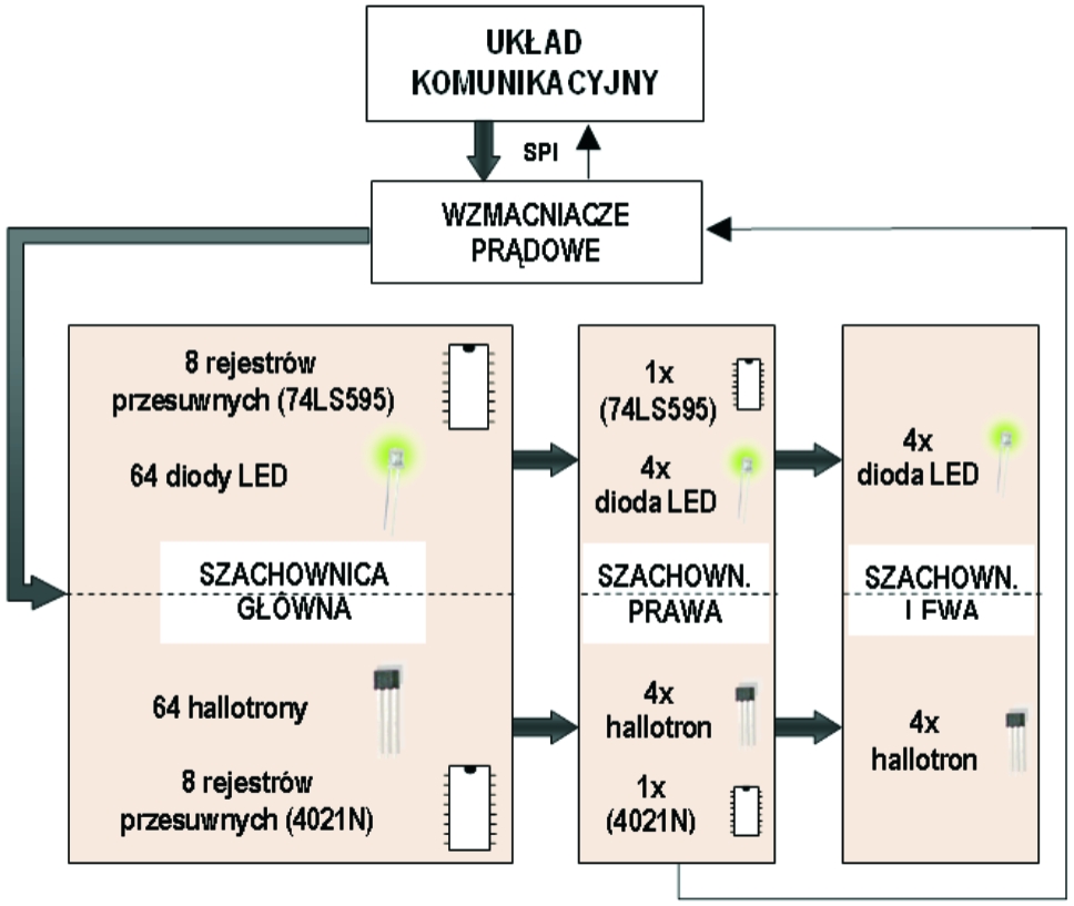 W trakcie wykonywania ruchu przez człowieka moduł komunikacyjny kontroluje cyklicznie stan na szachownicy. W tym celu w module szachownicy zamontowano układy rejestrów wejściowych, do których podłączono czujniki hallotronowe oraz rejestry wyjściowe, do których podłączono podświetlające pola szachownicy diody LED (rys. 2.). Do komunikacji z szachownicą zastosowano interfejs SPI.