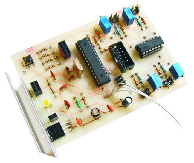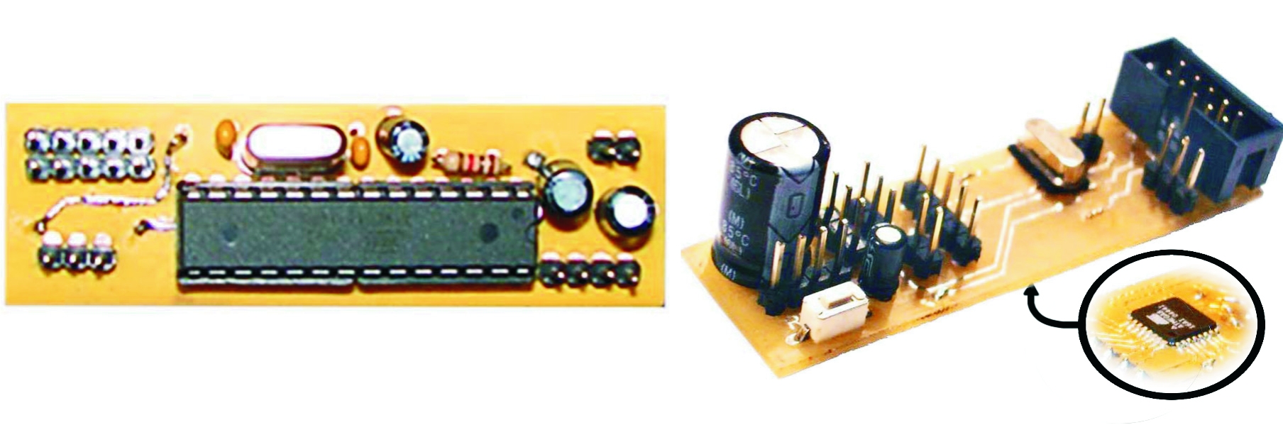 Rozkazy z komputera wysyłane są w postaci numerów pól tablic, w których w każdym procesorze zapisano odpowiadające zadanemu położeniu pola na szachownicy wypełnienie sygnału PWM. Procesory zmieniają szerokość impulsów z ustaloną stałą czasową umożliwiając poprawne wykonanie rozruchu i hamowania, ponieważ regulatory w serwomechanizmach mają zbyt krótką stałą czasową. W module kontrolującym pracę chwytaka zastosowano mikroprocesor ATmega8 [3] w obudowie SMD (rys. 3).