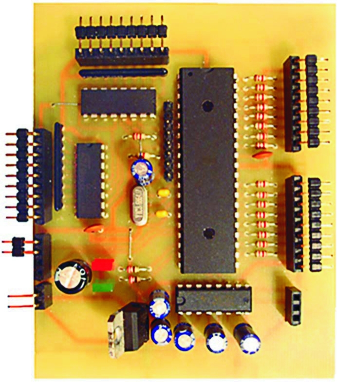 Do realizacji przyjętego algorytmu opracowano układ elektroniczny zgodny ze schematem blokowym (rys. 1). Ramię robota zostało wyposażone w moduły elektroniczne sterujące pracą serwomechanizmów (rys. 3). Podstawowymi elementami tych modułów są mikrokontrolery ATmega8 [3]. Ich zadaniem jest odbieranie rozkazów z komputera i odpowiednie wysterowanie serwomechanizmów. Do sterowania każdego złącza zastosowano oddzielny mikroprocesor.