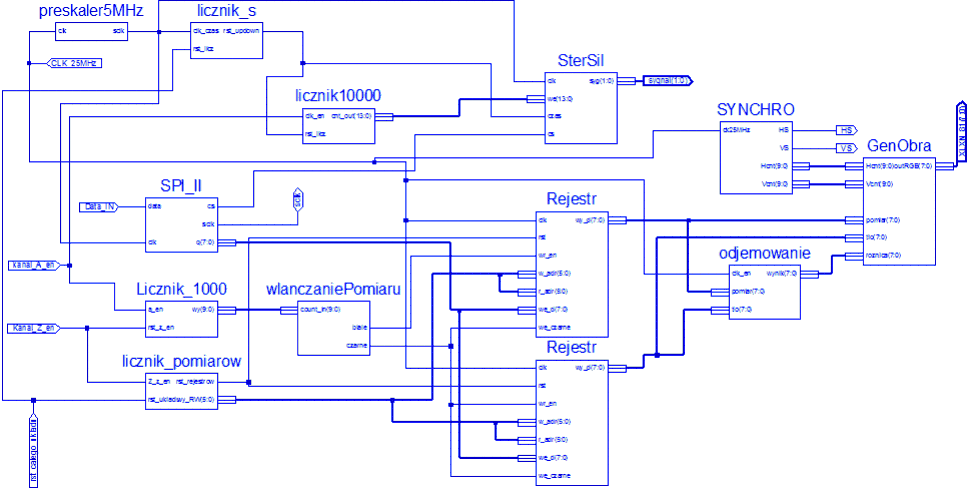 Celem projektu było opracowanie kompletnego sterownika urządzenia do pomiaru słabych sygnałów optycznych i jego implementacja w układzie FPGA. Podczas realizacji projektu wykorzystano elementy wcześniej opracowanej (przy współudziale autora) biblioteki VHDL. Jedynie w przypadku modułu synchronizacji w bloku obsługi monitora VGA bazowano na elemencie biblioteki udostępnionej na stronie internetowej firmy Digilent [3], który dostosowano we własnym zakresie do potrzeb projektu. Wszystkie pozostałe elementy biblioteki opracowano w ramach prac koła lub pracy dyplomowej.