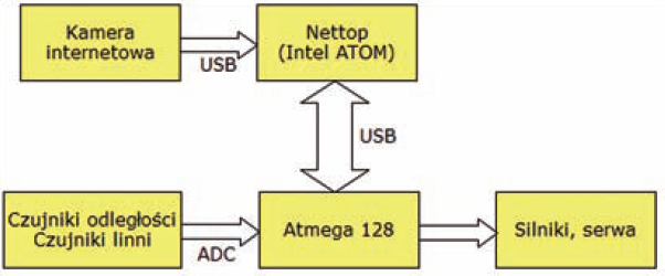 W robocie zaimplementowano układ sterowania przedstawiony na schemacie. Komputer NTT Home W 700P z procesorem Intel Atom otrzymuje i przetwarza obraz z kamery internetowej, podłączonej przez port USB. Na podstawie otrzymanych danych wysyła odpowiednie komendy do mikrokontrolera bezpośrednio sterującego silnikami. Komunikacja jest realizowana poprzez układ FT232RL (przejście USBUART).