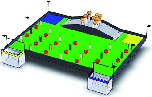 Najwyżej punktowane były pomarańcze, umieszczone na podwyższeniu pośrodku stołu, dalej kolby kukurydzy (białe walce) oraz pomidory. Czarne walce były przeszkodami na stałe przytwierdzonymi do stołu. Pozycje, na jakich umieszczone były kolby kukurydzy oraz przeszkody ustalano drogą losową przed rozpoczęciem meczu. Do dyspozycji uczestników były także wieżyczki (po trzy na zespół), na których można było umieszczać znaczniki pomagające w lokalizacji robota.