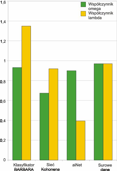 Analizując wyniki klasyfikacji pod kątem współczynnika w, najlepiej wypadł test surowych danych, zaraz za nim był klasyfikator BARBARA, następnie sieć Kohonena. Najgorsze wyniki dał klasyfikator aiNet. Wyniki przedstawione na wykresie potwierdza tab. 3.