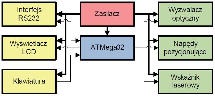 Do zasilania silników krokowych zastosowano układy TA8435H. Jednostka sterująca została wyposażona w interfejs RS-232 [1], umożliwiający podłączenie urządzenia do komputera. Na statywie zamontowany został laser pełniący rolę celownika. Schemat blokowy sterownika pokazano na rys. 2.