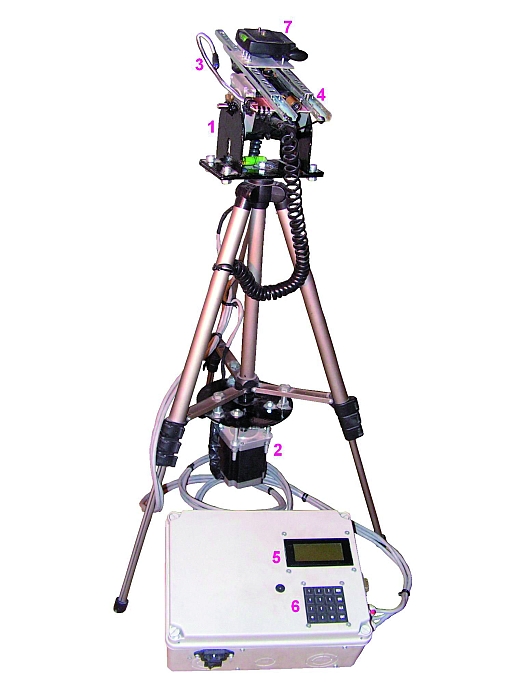 Rys. 1. Prototyp urządzenia do zautomatyzowanego wykonywania zdjęć do tworzenia panoram (1 – silnik krokowy, 2 – silnik krokowy, 3 – dioda nadawcza wyzwalacza optycznego, 4 – wskaźnik laserowy, 5 – wyświetlacz LCD, 6 – klawiatura, 7 – mechanizm mocowania aparatu)