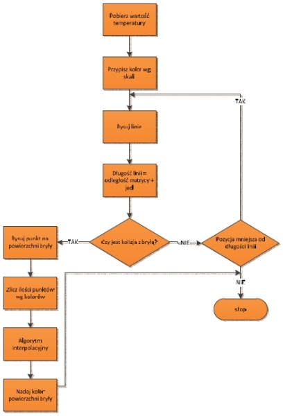 W zrealizowanej aplikacji zaproponowany został autorski algorytm mapowania danych z termografu na obiekcie 3D. Schemat algorytmu zobrazowano na rys. 1. Głównym celem wykonanej aplikacji jest nadanie barwy (zgodnie z barwą odpowiadającą temperaturze uzyskanej z pomiarów) modelowi trójwymiarowemu badanego obiektu. Aplikacja jest uniwersalna, gdyż umożliwia wykonywanie dowolnych modeli badanych urządzeń zgodnie z dokumentacją techniczną.