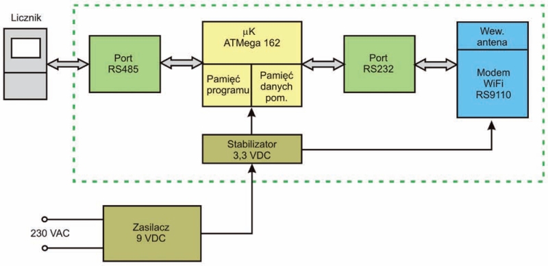 Ideą układu było stworzenie przezroczystego konwertera Wi-Fi – RS-485. Dane wysyłane przez liczniki energii elektrycznej i inne urządzenia przemysłowe częściej wykorzystują interfejs RS-485 niż interfejs RS-232. Natomiast bardzo często w zasięgu urządzenia bezprzewodowego znajduje się już istniejąca sieć WLAN. Stąd pomysł na budowę układu, który potrafiłby w prosty sposób odebrać dane z licznika i wysłać je siecią bezprzewodową do operatora lub bazy danych. Łączność powinna działać w obie strony, ponieważ do licznika należy wysłać zapytanie o bieżące odczyty lub o profil. Projektowane urządzenie powinno też umożliwiać ustawianie parametrów sieci bezprzewodowej z poziomu komputera, np. hasła dostępowego, nazwy sieci, IP.