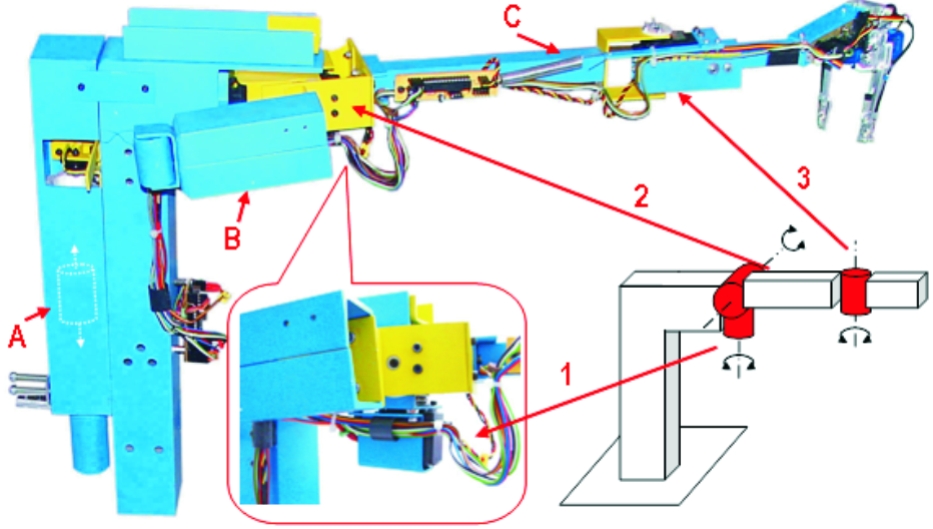 Rys. 1. Manipulator - konstrukcja mechaniczna. 1, 2, 3 – serwomechanizmy w przegubach, A, B, C – układy odciążające i kasowania luzów